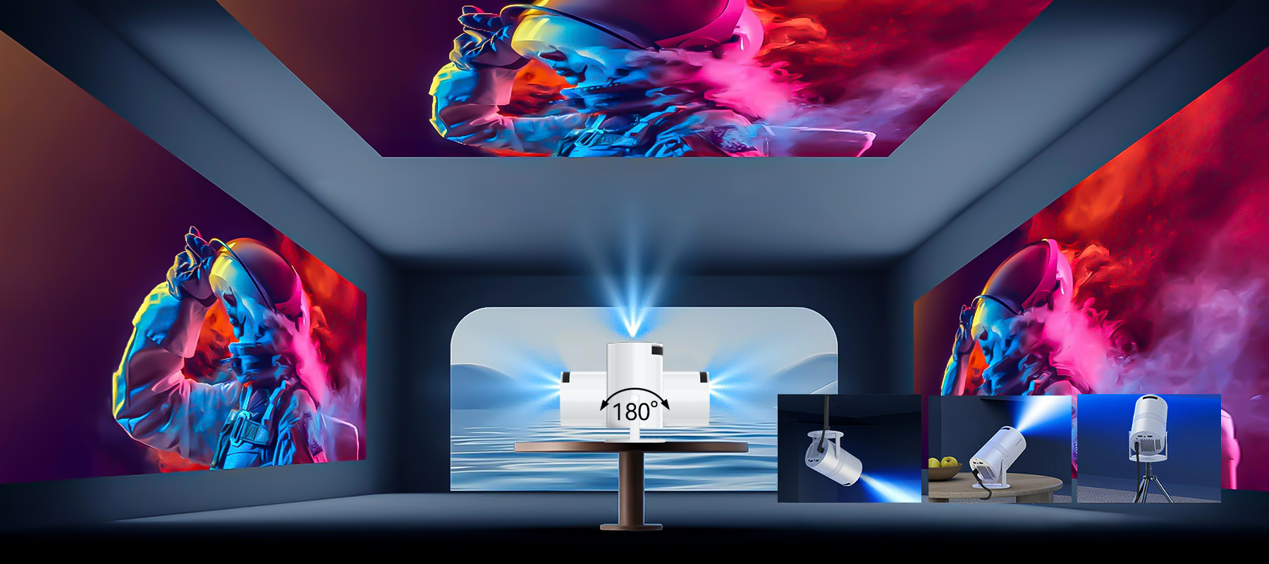 - 180° Drehbare Projektion: Projektieren Sie auf die Decke und schauen Sie aus jeder bequemen Position.